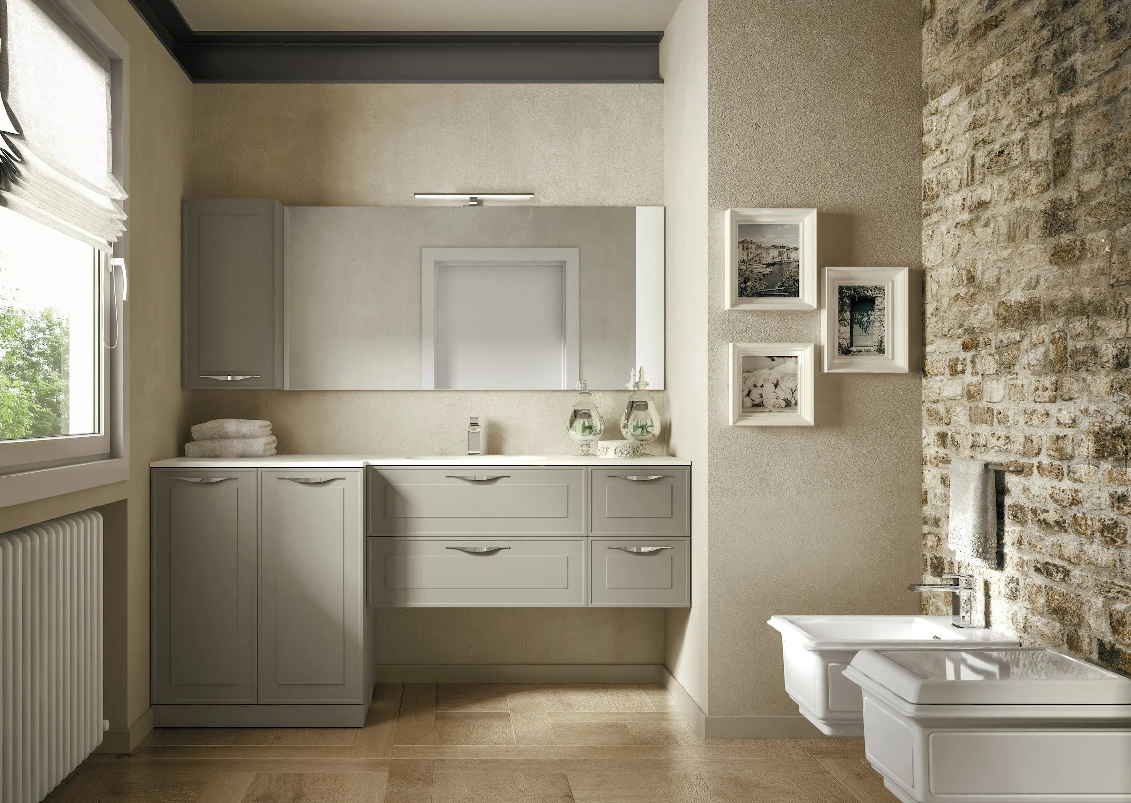 The air of classical bathroom furniture combines with the aesthetics of modern bathrooms through customisable installation: suspended bathroom cabinets and tops with integrated wash basin cater for all tastes.